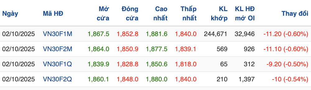 Trên thị trường chứng khoán phái sinh, phiên giao dịch ngày 2/10 ghi nhận diễn biến tiêu cực của các hợp đồng tương lai VN30 khi đồng loạt giảm điểm. Hợp đồng VN30F1M (mã 41I1FA000) kết phiên lùi 11,2 điểm (-0,60%) về 1.852,8 điểm, chênh lệch âm -7 điểm so với chỉ số cơ sở. Các kỳ hạn xa hơn như VN30F2M (41I1FB000), VN30F1Q (41I1G3000) và VN30F2Q (VN30F2512) đều giảm từ 9 đến 11 điểm, thu hẹp khoảng chênh lệch âm xuống còn -8,9 đến -31 điểm.