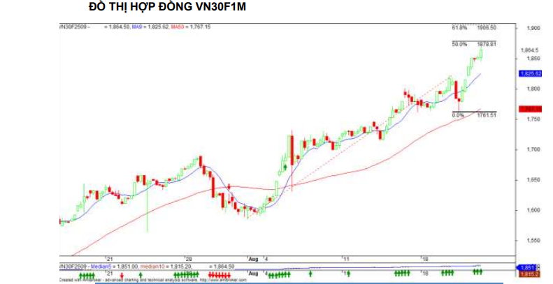 Trên biểu đồ kỹ thuật khung 1 giờ, hợp đồng VN30F2509 đồ thị giá tiếp tục tăng mạnh và đang mở rộng đà tăng ở sóng 3. Tâm lý đang hưng phấn trên thị trường phái sinh với vùng 1.850-1.855 điểm sẽ hỗ trợ cho nhịp điều chỉnh. Khu vực 1.880-1.900 điểm là mục tiêu hướng tới trong các phiên tới.