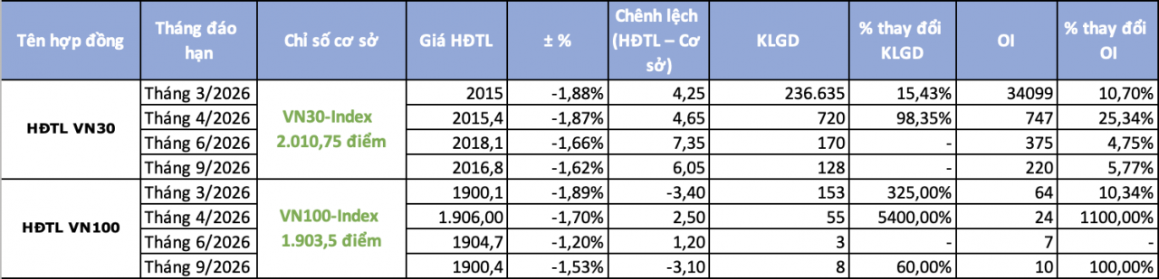 Đối với các hợp đồng tương lai VN100, giá hợp đồng tương lai VN100 đáo hạn tháng 3/2026 cũng giảm khá mạnh (-1,89%). Nhờ giảm ít hơn chỉ số cơ sở, chênh lệch âm được thu hẹp. Trong khi, tại các hợp đồng đáo hạn tháng 4/2026 và tháng 6/2026, giá nhỉnh nhẹ so với chỉ số VN100-Index.