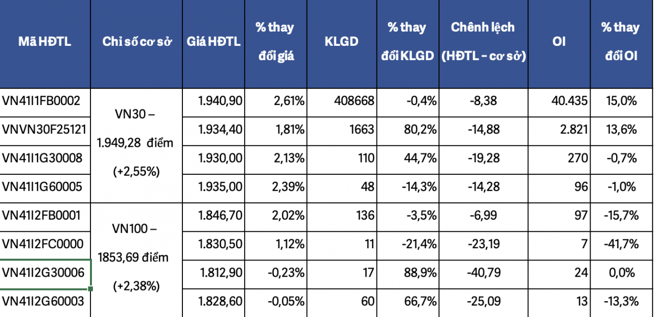 Đối với các hợp đồng tương lai dựa trên chỉ số VN100-Index, chênh lệch âm đồng loạt nới rộng. VN100-Index tăng 2,38% trong phiên. Tuy nhiên, các hợp đồng tương lai đáo hạn vào tháng 3/2026 và tháng 6/2026 đồng loạt đóng cửa trong sắc đỏ. Chênh lệch âm giữa giá hợp đồng VN41I2G30006 đáo hạn tháng 3/2026 với chỉ số cơ sở nới lên hơn - 40 điểm.
