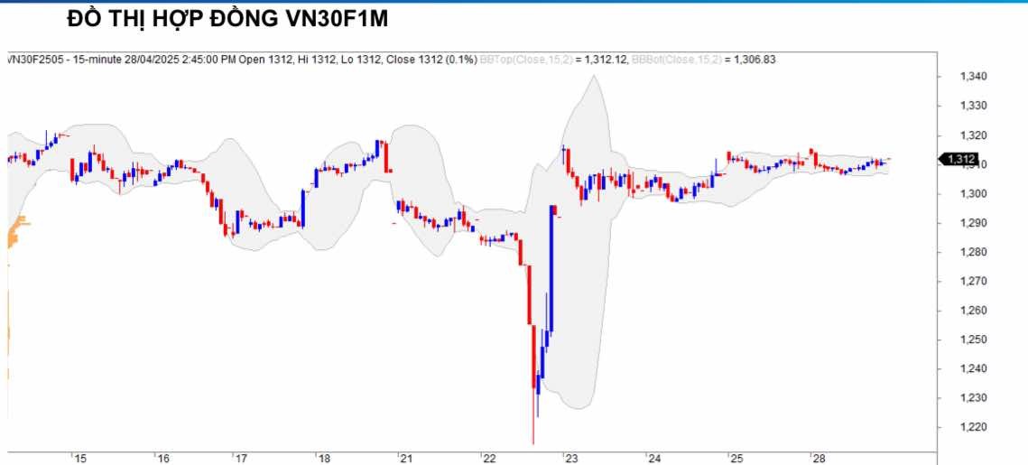 Trên thị trường chứng khoán phái sinh phiên giao dịch ngày 28/4, các hợp đồng tương lai tiếp tục biến động hẹp trong đó VN30F2505 biến động trong vùng 1.306 - 1.315 điểm. Về cuối phiên, các hợp đồng được kéo tăng nhẹ trên vùng giá xanh.