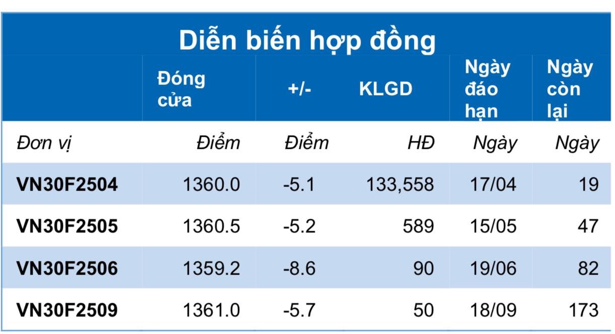 Riêng hợp đồng tháng, hiện tại VN30F2504 đóng cửa tại 1.360 điểm, giảm -5,1 điểm so với phiên kế trước. Mức giảm của hợp đồng này ít hơn mức giảm của chỉ số cơ sở, nên khoảng cách chênh lệch thu hẹp ghi nhận trạng thái âm với mức -3,9 điểm.