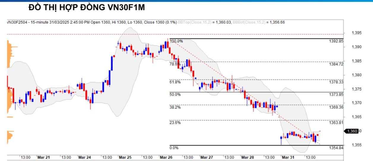 Trên biểu đồ kỹ thuật khung 1 giờ, hợp đồng VN30F2504 xác nhận mẫu hình 2 đáy ngắn hạn tại 1.355 điểm với chỉ báo xu hướng (RSI) xuất hiện phân kỳ tăng. Điều này cho thấy hợp đồng này sẽ còn cơ hội hồi phục lên 1.370 điểm trong ngắn hạn. Tuy nhiên, xu hướng ở khung 1 giờ vẫn đang ở trạng thái giảm.