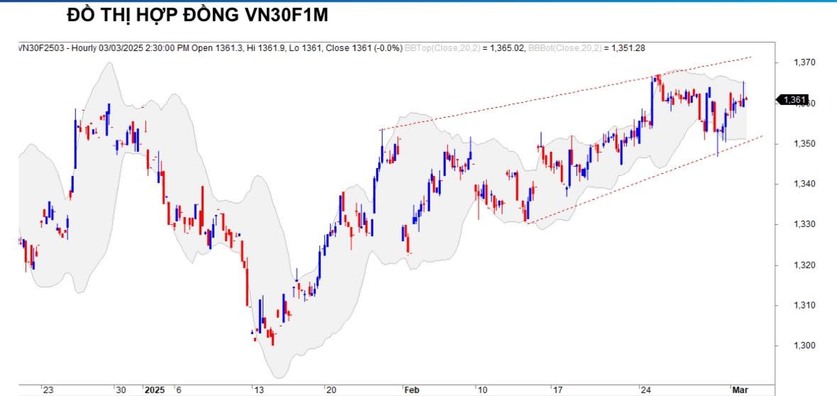 Trên biểu đồ kỹ thuật khung 1 giờ, VN30F2503 kiểm định vùng 1.365-1.370 điểm trong phiên hôm nay nhưng vẫn duy trì xu hướng tăng. Đây là vùng kháng cự mạnh khi hội tụ đỉnh cũ. Chỉ báo xu hướng RSI đang xuất hiện phân kỳ giảm cho thấy giá khó vượt lên trên vùng cản trên.
