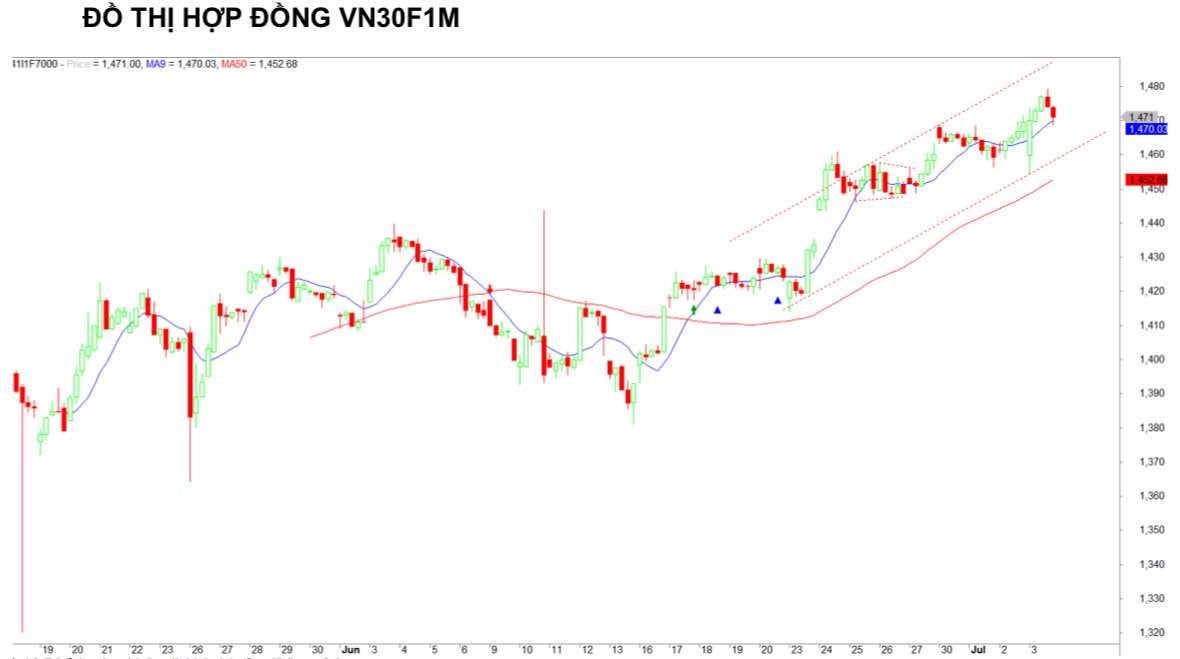 Trên biểu đồ kỹ thuật khung 1 giờ, hợp đồng VN30F2507 tăng theo đường kênh giá tăng ngắn hạn nhưng cấu trúc tăng sóng 5 cho thấy sóng tăng có thể vào giai đoạn cuối. Ở khung 15 phút, giá đã đi xuống MA9 nhưng ở trên MA50. Như vậy, xu hướng sẽ rõ ràng hơn trong phiên tới khi giá hồi phục lại nhưng không vượt được 1.473 - 1.475 điểm, xác nhận nhịp điều chỉnh ngắn hạn.