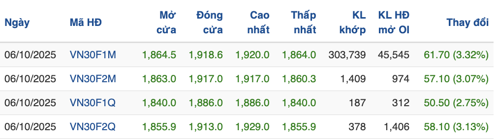 Trên thị trường phái sinh, hợp đồng tương lai VN30F1M tăng mạnh 61,7 điểm (+3,32%) lên 1.918,6 điểm, thu hẹp độ chênh lệch giữa giá hợp đồng phái sinh so với chỉ số cơ sở VN30-Index về còn -0,37 điểm. Các hợp đồng kỳ hạn xa hơn như VN30F2M, VN30F1Q và VN30F2Q cũng tăng trên 2,7% - 3,1%, với chênh lệch âm dao động từ -1,97 đến -32,97 điểm.