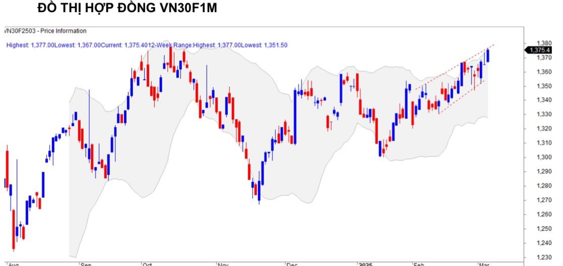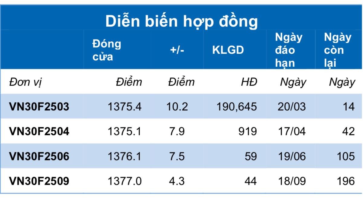 Hợp đồng tháng VN30F2503 đóng cửa tại 1.373,4 điểm, tăng +10,2 điểm so với phiên trước. Mức tăng của hợp đồng này ít hơn mức tăng của chỉ số cơ sở, nên khoảng cách chênh lệch âm duy trì và nới rộng với mức -4,2 điểm.