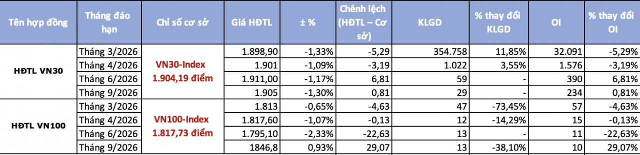 Trên thị trường phái sinh cũng bao trùm trong sắc đỏ khi có tới 7/8 hợp đồng tương lai giảm giá. Hợp đồng tương lai dựa trên chỉ số VN30 đáo hạn tháng 3/2026 (VN41I1G3000) đóng cửa tại 1.898,9 điểm, giảm 1,33% so với phiên trước. Mức giảm "khiêm tốn" hơn đã thu hẹp đáng kể chênh lệch so với chỉ số cơ sở đã thu hẹp còn -5,29 điểm. Trạng thái chênh lệch âm đã bất ngờ nới rộng trong phiên hôm qua ở các kỳ hạn. Với các hợp đồng tương lai dựa trên VN30 kỳ hạn xa hơn, trạng thái chênh lệch âm cũng được duy trì, với mức chênh lệch dao động từ khoảng -3 điểm đến -14 điểm.