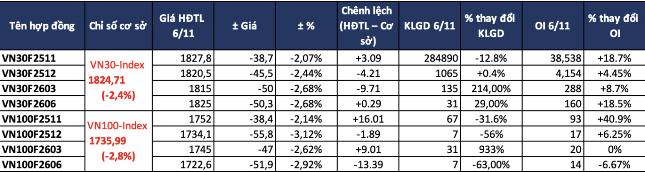 Sắc đỏ áp đảo với 8/8 hợp đồng tương lai giảm giá theo nhịp điều chỉnh sâu của thị trường cơ sở. Hợp đồng gần nhất VN30F2511 giảm 38,7 điểm (-2,07%), mức giảm thấp hơn VN30-Index (-2,40%), giúp chênh lệch chuyển sang dương +3,1 điểm. Trong nhóm hợp đồng VN100, phần lớn kỳ hạn cũng giảm theo biên độ từ 2-3% nhưng mức giảm vẫn thấp hơn chỉ số cơ sở, khiến chênh lệch duy trì ở vùng dương hoặc thu hẹp mức âm so với phiên hôm qua.