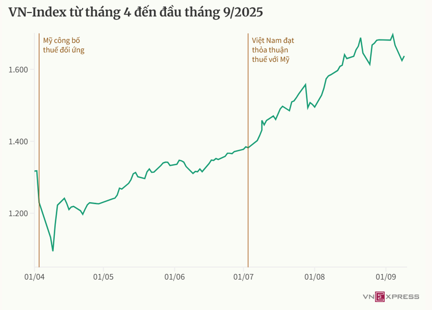 Trong báo cáo mới đây, SGI Capital - công ty quản lý quỹ mở The Ballad Fund - đề cập đến việc VN-Index đã tăng liên tục 5 tháng nếu tính đáy tháng 4, với mức tăng gần 60% mà không có nhịp điều chỉnh lớn nào trên 10%. Đây là một trong những nhịp tăng nhanh và mạnh nhất trong lịch sử thị trường chứng khoán Việt Nam với lực đẩy chủ yếu đến từ dòng tiền trong nước.