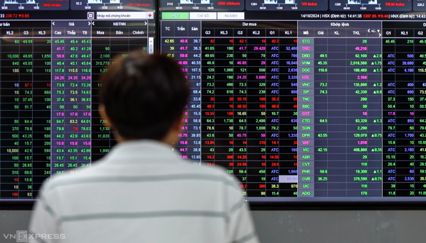 Nhà đầu tư đang theo dõi bảng điện tử tại trụ sở một công ty chứng khoán ở TP HCM. Ảnh: An Khương