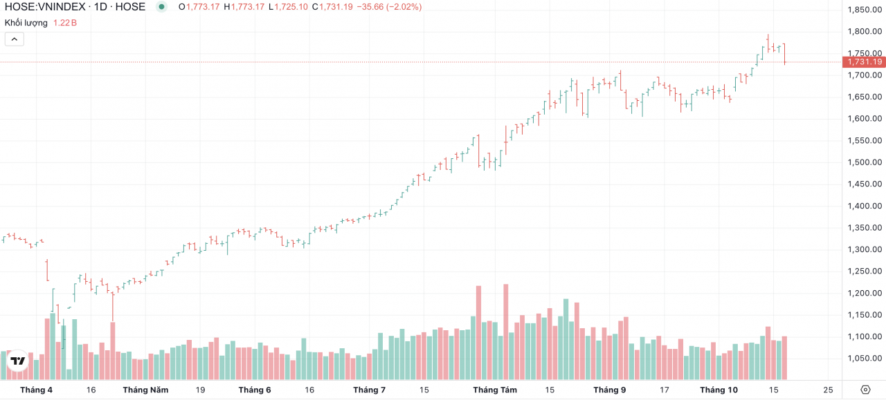 VN-Index tiến gần ngưỡng 1.800 điểm trong phiên 14/10 - Nguồn: TradingView