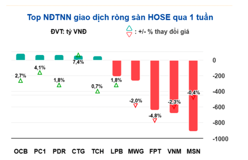 Thanh khoản thị trường diễn biến tích cực hơn khi giá trị giao dịch trên sàn HOSE tăng hơn 27% so với tuần trước. Một điểm trừ là khối ngoại vẫn miệt mài bán ròng, khi tuần qua, hơn 4.100 tỉ đồng tiếp tục được rút ròng khỏi VN-Index, tập trung vào MSN, VNM, FPT…