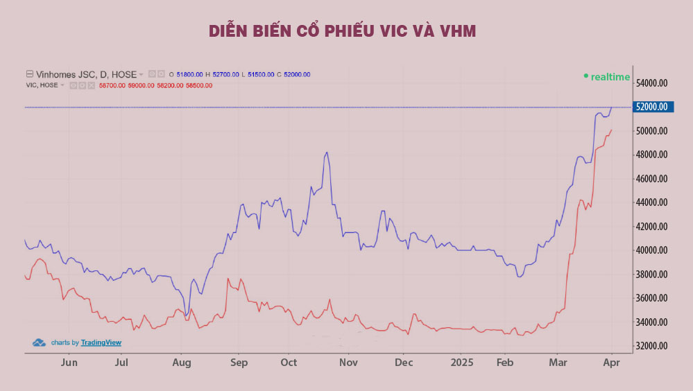 Đáng chú ý, nếu không có sự “cầm trịch” của cổ phiếu VIC và VHM, VN-Index thậm chí đã còn giảm mạnh hơn. Đi ngược với thị trường chung, cổ phiếu VIC vẫn tăng hơn 15% trong nửa cuối tháng 3 và ghi nhận mức tăng gần 43% trong tháng 3, leo lên mức cao nhất kể từ tháng 9-2023. Tương tự, cổ phiếu VHM cũng tăng 11% và 26% trong cùng khoảng thời gian và hiện đã đạt mức giá cao nhất kể từ tháng 9-2023.