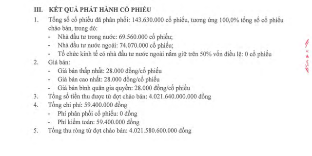Theo đó, tổng số cổ phiếu đã phân phối là 143,63 triệu cổ phiếu, tương ứng 100% tổng số cổ phiếu chào bán. Trong đó, nhà đầu tư trong nước mua 69,56 cổ phiếu và nhà đầu tư nước ngoài mua 74,07 cổ phiếu.