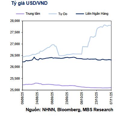 Diễn biến tỷ giá USD/VND trong tháng 10 và đầu tháng 11 trở thành tâm điểm của thị trường tài chính, khi mức tăng diễn ra nhanh và lan rộng sang nhiều kênh. Theo nhóm phân tích của Công ty Chứng khoán Thiên Việt (TVS), tỷ giá USD/VND trên thị trường tự do đã tăng liên tục nhiều tuần, chạm ngưỡng khoảng 27.800 đồng/USD, mức tăng hơn 7% so với đầu năm.