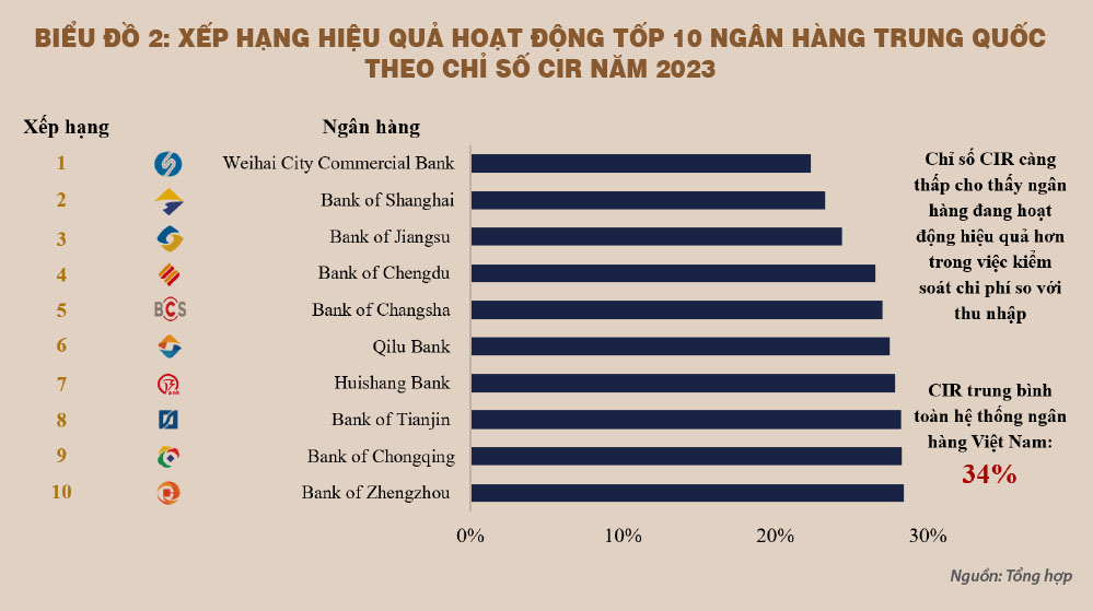 Tác động rõ nhất được phản ánh ở chỉ số CIR. CIR toàn hệ thống giảm từ hơn 40% xuống bình quân 33-34%, trong đó các ngân hàng có đầu tư mạnh về công nghệ như CCB, Zheshang Bank, CMB đạt mức dưới 30%. Đây là một chỉ số thể hiện sự chuyển dịch bền vững về năng lực vận hành. Mức tỷ lệ CIR này được xem là rất tốt nếu so sánh với các ngân hàng đang có chỉ số này tốt nhất ở Việt Nam. Các ngân hàng quản trị hệ số CIR tốt nhất ở Việt Nam cũng chỉ được khoảng 23-30%.