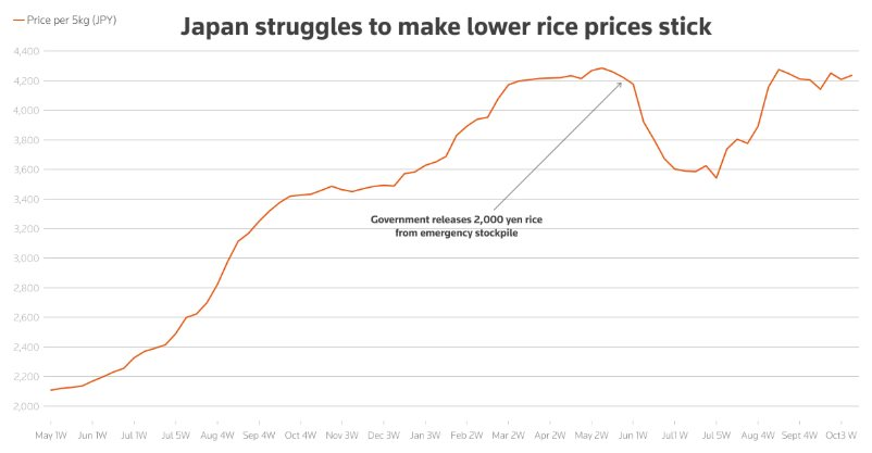 Trong tuần kết thúc vào ngày 14/11, giá trung bình của gạo 5 kg bán tại khoảng 1.000 siêu thị trên toàn quốc đã tăng lên 4.316 yên, cao hơn 81 yên so với tuần trước đó. Mức này vượt qua kỷ lục 4.285 yên được thiết lập vào tháng 5 năm nay, bất chấp thị trường đang chào đón lượng gạo mới thu hoạch – vốn thường giúp hạ nhiệt giá trong ngắn hạn.