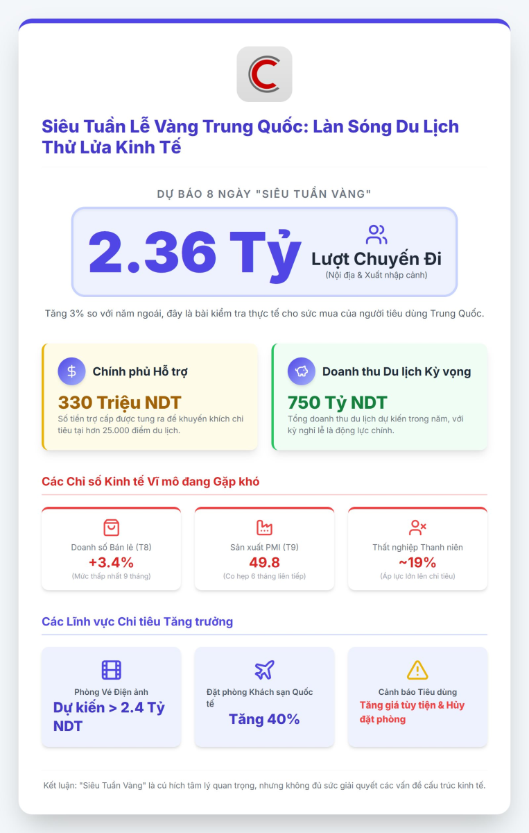 Trong bối cảnh Trung Quốc vật lộn với tăng trưởng chậm, nợ công địa phương và áp lực từ thương chiến, "siêu tuần vàng" trở thành một bài test không chỉ về khả năng phục hồi tiêu dùng, mà còn về hiệu quả của các chính sách kích cầu ngắn hạn.