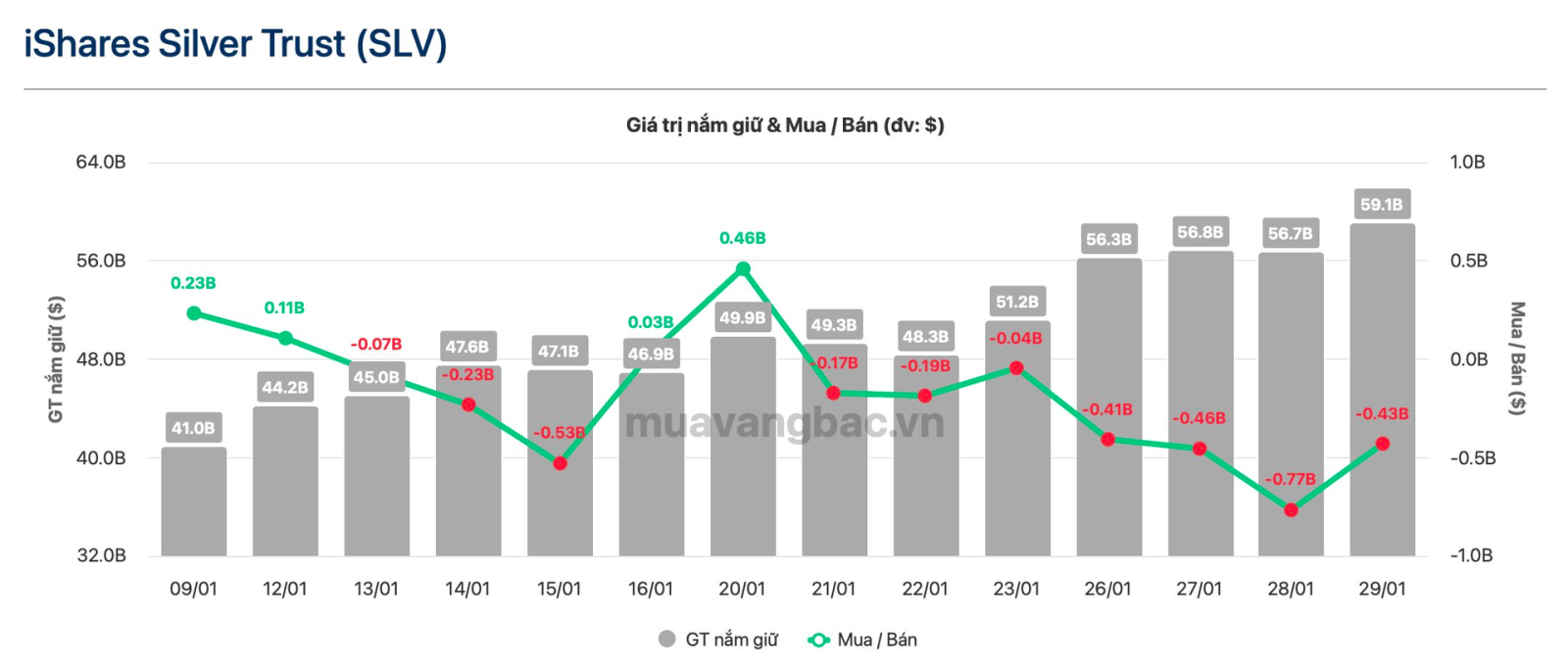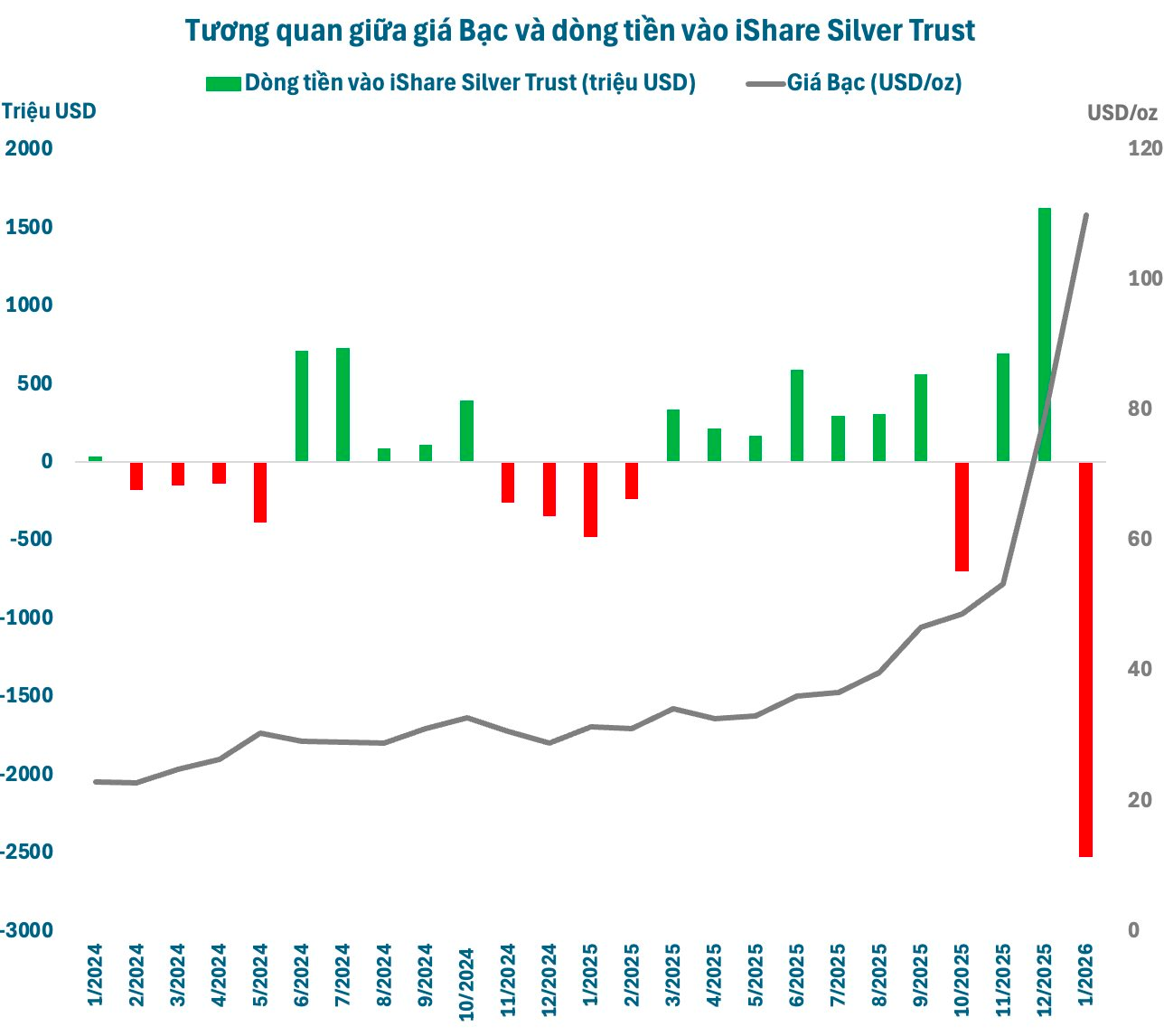 Dòng vốn rút ròng khoảng 2,5 tỷ USD trong 7 ngày khiến quỹ bạc lớn nhất thế giới SLV phải bán ra lượng bạc đáng kể.
