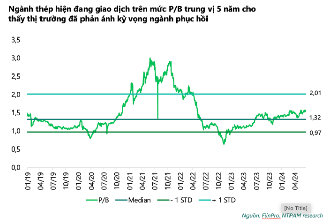 Thứ sáu, nhóm thép cũng có cơ hội khi giá vật liệu đầu vào dần ổn định, sản lượng thép tiêu thụ dần hồi phục. Tuy nhiên định giá ngành này đã trên mức P/B trung vị 5 năm cho thấy thị trường đã phản ánh kỳ vọng phục hồi.