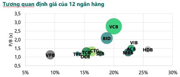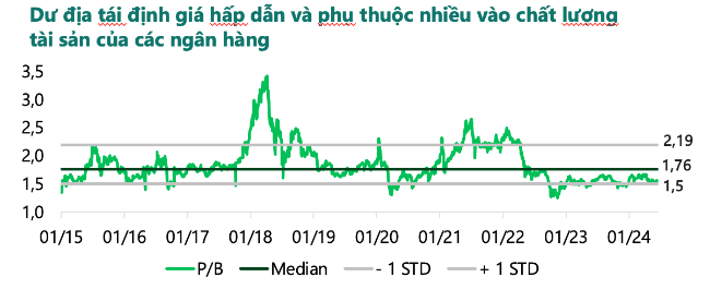 Thứ nhất, nhóm ngân hàng với kỳ vọng tăng trưởng tín dụng dần cải thiện, chất lượng tài sản được kiểm soát và định giá hấp dẫn. Theo đó, định giá nhóm ngân hàng đang ở dưới mức trung bình 5 năm qua, song dư địa tái định giá hấp dẫn và phụ thuộc nhiều vào chất lượng tài sản của các ngân hàng. Đặc biệt cần cân đối rủi ro với triển vọng mở rộng NIM, nợ xấu gia tăng gây áp lực lên chi phí dự phòng.
