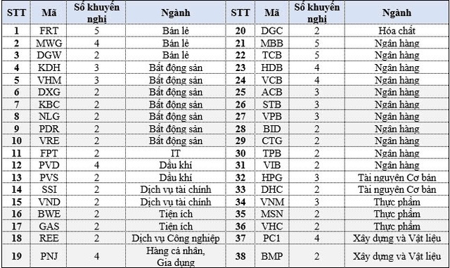 Nếu xét theo số lượng cổ phiếu được nhiều chuyên gia phân tích quan tâm (4 khuyến nghị trở lên), có 9 cổ phiếu nổi bật, trong đó có 4 cổ phiếu thuộc nhóm ngân hàng và 2 thuộc nhóm bán lẻ. Đáng chú ý, các mã FRT, MBB và TCB nhận được 5 khuyến nghị mua từ các chuyên gia phân tích, cao nhất trong tháng 12.