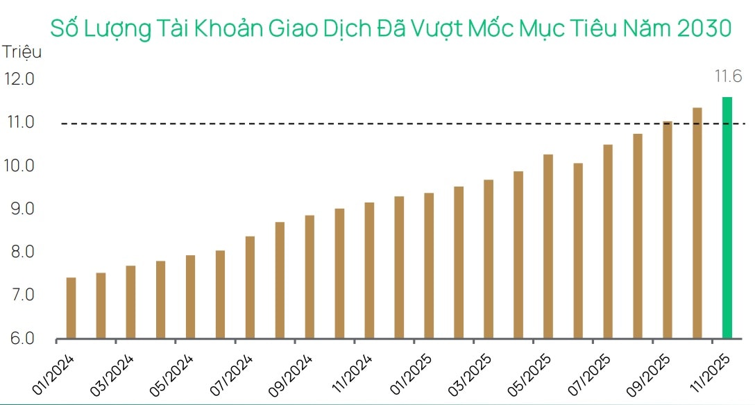 Thị trường cũng ghi nhận 237.000 tài khoản giao dịch mới được mở trong tháng, nâng tổng số tài khoản cá nhân lên 11,6 triệu - vượt xa mục tiêu toàn thị trường đến năm 2030 là 11 triệu. Khối ngoại tiếp tục rút ròng khoảng 260 triệu USD, đưa tổng giả trị bán ròng từ đầu năm lên 5.2 tỷ USD. Tuy nhiên theo bà Minh, tốc độ bán chậm lại và xuất hiện những giai đoạn mua ròng chọn lọc, là tín hiệu tích cực ban đầu.