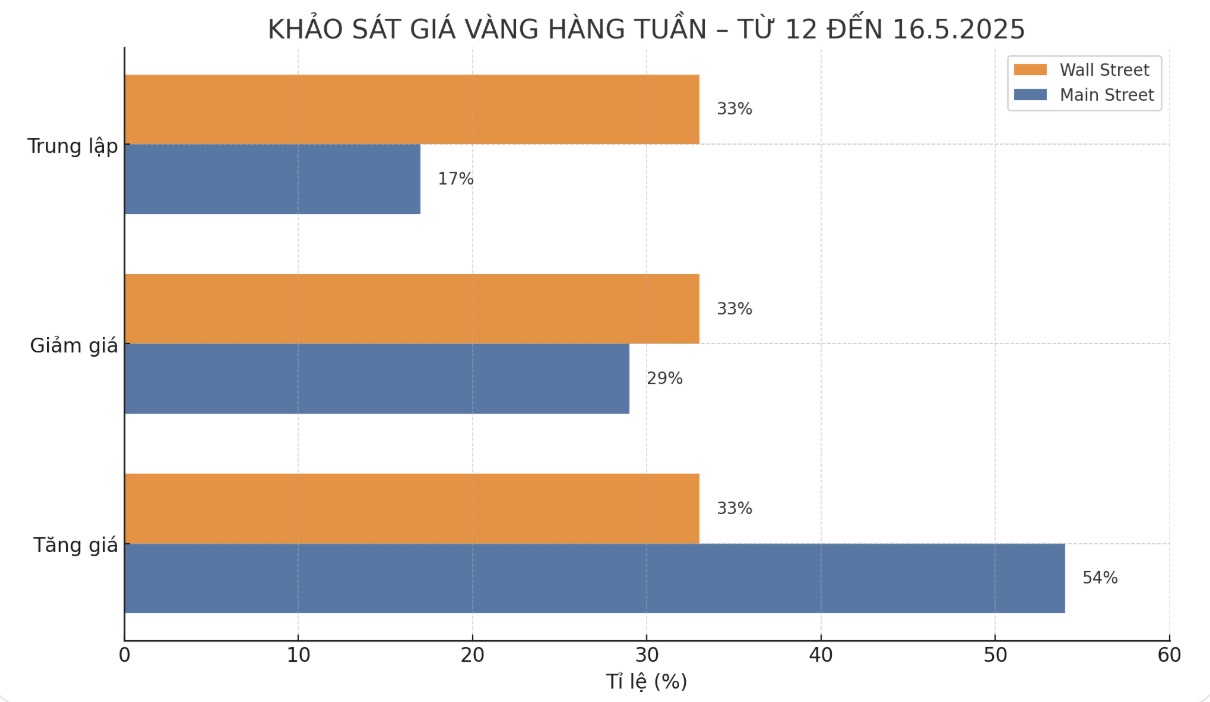 Khảo sát trực tuyến trên Kitco thu hút 267 nhà đầu tư nhỏ lẻ tham gia, với kết quả tiếp tục nghiêng về xu hướng tăng như tuần trước. 144 người (54%) tin rằng giá vàng sẽ tăng, 77 người (29%) dự báo giá giảm, còn 46 người (17%) cho rằng giá sẽ đi ngang trong tuần tới.