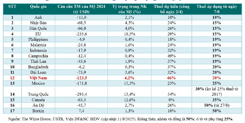 Mức thuế đối ứng Mỹ áp dụng từ ngày 7/8/2025. Nguồn: TS.Cấn Văn Lực