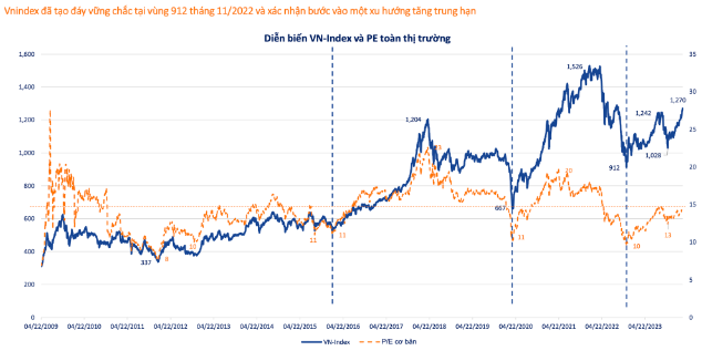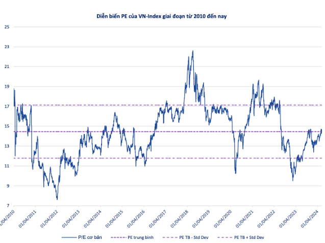 Định giá VN-Index đang về khoảng 14,3-14,5 lần, đây là mức định giá nằm ở nửa dưới của đường trung bình của VN- Index trong 20 năm trở lại đây. Thông thường, nếu định giá nằm ở nửa dưới thì là vùng định giá còn hợp lý và còn biên tăng lên vùng nửa trên. Khi đang biến động sát đường bình quân, thì một nhịp điều chỉnh của thị trường sẽ làm cho định giá thị trường "mềm" hơn.