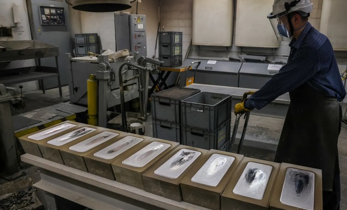 Những thỏi bạc mới đúc nặng 30 kg đang nguội trong khuôn tại nhà máy ở Krasnoyarsk, Nga. Ảnh: Getty Images