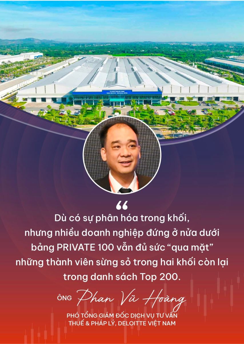 Đây là tín hiệu rất tích cực, vì nguồn thu ngân sách sẽ không chỉ phụ thuộc vào một vài đầu tàu, mà được chia sẻ rộng hơn. Ngoài ra, dù có sự phân hóa trong khối, nhưng nhiều doanh nghiệp đứng ở nửa dưới bảng PRIVATE 100 vẫn đủ sức “qua mặt” những thành viên sừng sỏ trong hai khối còn lại trong danh sách Top 200.