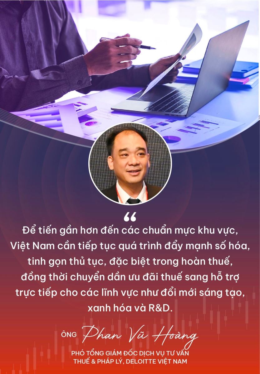 Để tiến gần hơn đến các chuẩn mực khu vực, Việt Nam cần tiếp tục quá trình đẩy mạnh số hóa, tinh gọn thủ tục, đặc biệt trong hoàn thuế, đồng thời chuyển dần ưu đãi thuế sang hỗ trợ trực tiếp cho các lĩnh vực như đổi mới sáng tạo, xanh hóa và R&D.
