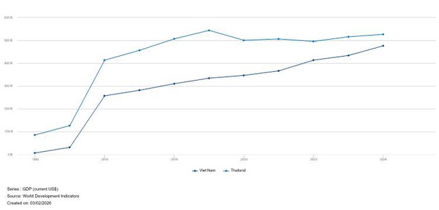 Quy mô GDP Việt Nam và Thái Lan giai đoạn 1990-2024. Nguồn: World Bank