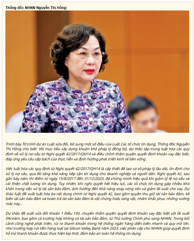 Trong khi đó, theo đại biểu Nguyễn Thị Thu Hà, đoàn Quảng Ninh, Nghị quyết 42 chưa giải quyết triệt để các vấn đề liên quan đến xử lý nợ xấu. Khi Nghị quyết hết hiệu lực, các tổ chức tín dụng gặp nhiều khó khăn vì không có quyền thu hồi tài sản khi bên giữ tài sản bảo đảm không bàn giao, dẫn đến xử lý nợ xấu gặp nhiều khó khăn. Do đó, việc luật hóa Nghị quyết 42 sẽ tôn trọng quyền tự do, tự nguyện cam kết của các bên trong việc cho vay và thu hồi nợ, đồng thời tạo điều kiện để các tổ chức tín dụng xử lý tài sản bảo đảm sớm nhất. Bà cũng đánh giá cao quy định về kê biên tài sản, cho rằng điều này giúp giải quyết các vướng mắc của tổ chức tín dụng và tổ chức xử lý nợ, qua đó hài hòa lợi ích giữa chủ nợ và bên nhận tài sản bảo đảm.