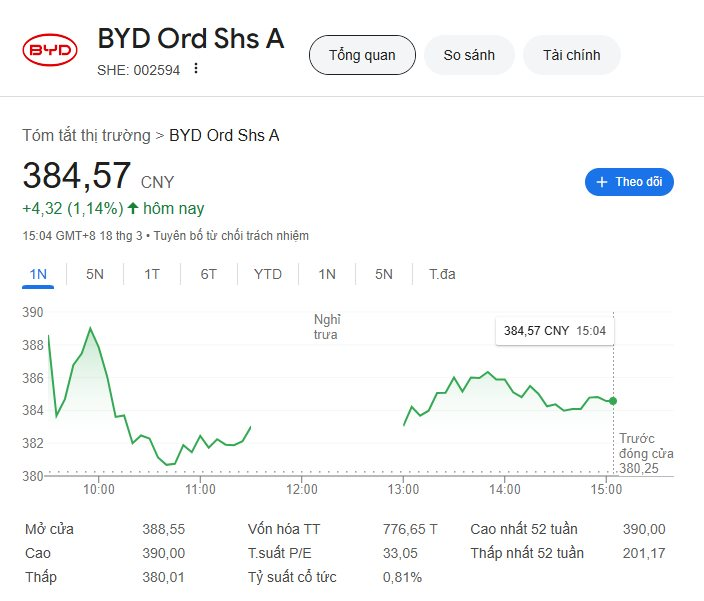 Ngay từ đầu phiên, cổ phiếu BYD tại Hang Seng đã tăng hơn 6%. Kết thúc phiên giao dịch, cổ phiếu đóng cửa với mức 4,2%. Cổ phiếu BYD niêm yết tại Thâm Quyến cũng tăng hơn 2% trong đầu phiên trước khi thu hẹp đà tăng.