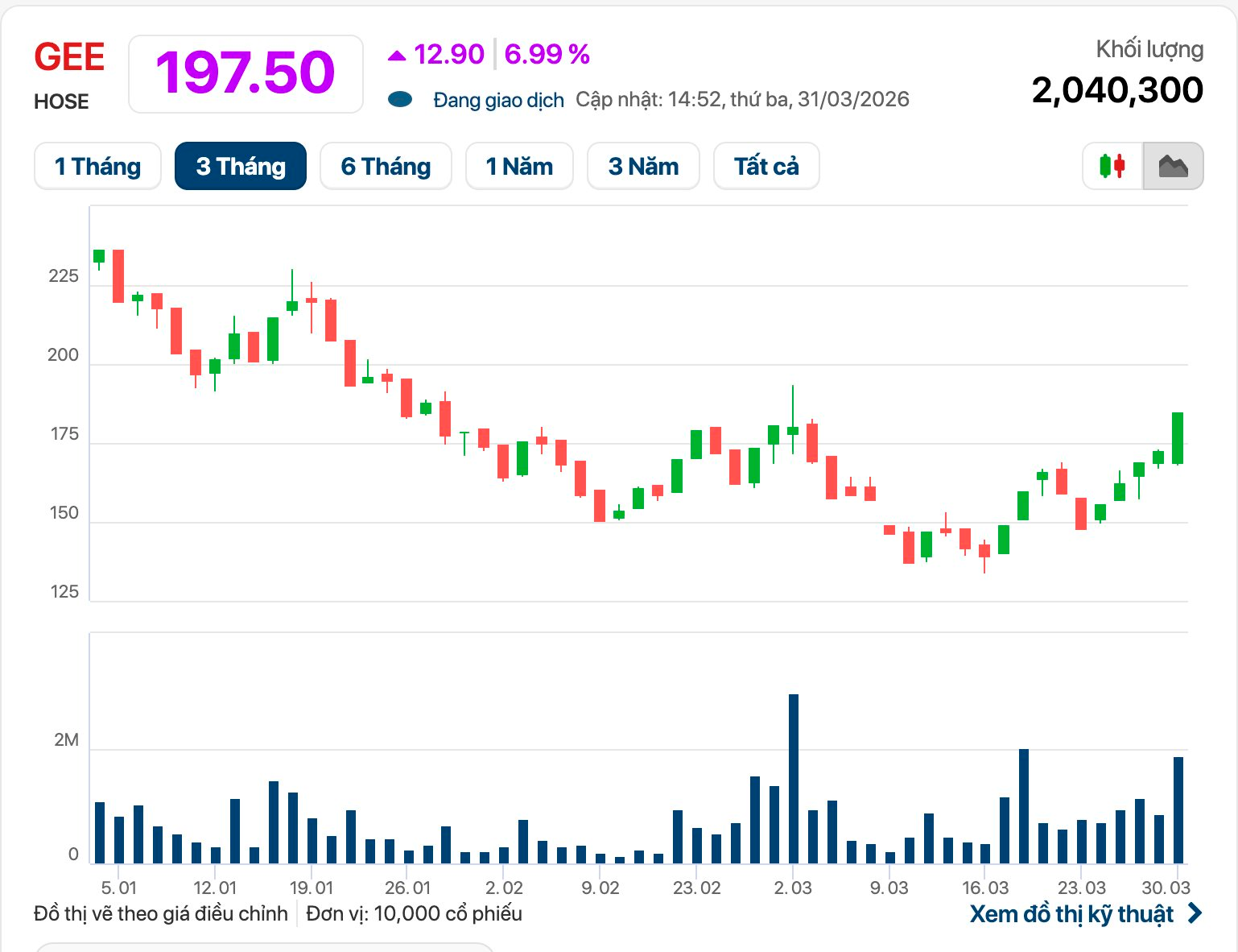Cụ thể, kết phiên 31/3, giá cổ phiếu GEE ở mức 197.500 đồng/cổ phiếu, tăng trần 6,99% so với phiên trước, khối lượng cổ phiếu giao dịch khớp lệnh đạt hơn 2 triệu đơn vị.