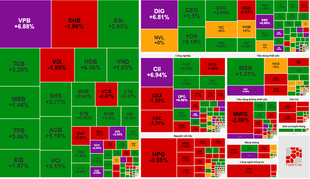 Tâm điểm của phiên hôm nay chính là nhóm ngân hàng khi hàng loạt cổ phiếu ghi nhận mức tăng ấn tượng. VPB (+6,88%), HDB (+6,56%), TPB (+5,46%), ACB (+5,18%) hay TCB (+3,29%) đồng loạt bứt phá, góp phần lớn vào đà tăng của chỉ số. Đáng chú ý, VPB trở thành một trong những mã tăng mạnh nhất toàn thị trường, sắc tím xuất hiện ở nhiều cổ phiếu ngành tài chính – chứng khoán như VDS, BSI, DSE.