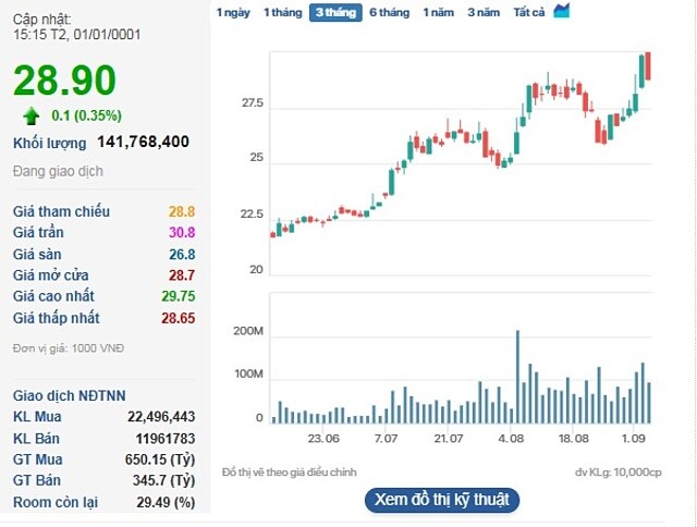 Chốt phiên, cổ phiếu HPG tăng lên 28.900 đồng/cp - mức cao nhất trong vòng 4 năm, với tổng khối lượng đạt hơn 141 triệu đơn vị.