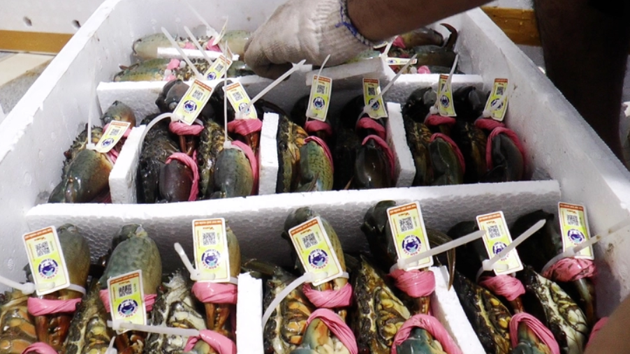 Một vựa cua ở Cà Mau ứng dụng công nghệ quét mã truy xuất nguồn gốc cua và trói cua bằng dây ni lông với trọng lượng không đáng kể - Ảnh: THANH HUYỀN