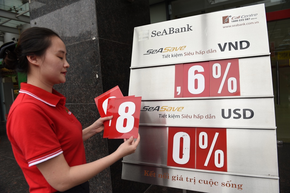 Nhân viên Ngân hàng SeABank chi nhánh Hà Nội điều chỉnh bảng lãi suất. Ảnh: Phạm Hùng