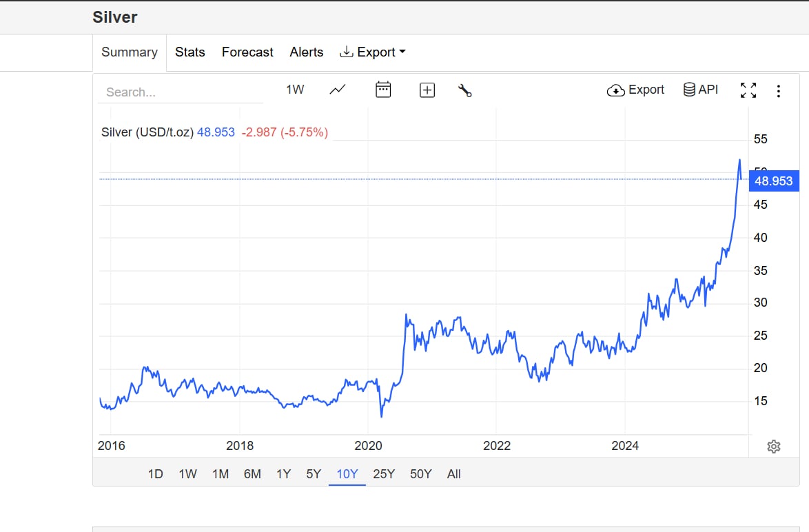 Giá bạc ngày 23/10 là 48 USD/ounce, giảm khoảng 10% so với mức cao kỷ lục ghi nhận vào tuần trước. Tính từ đầu năm đến nay, giá kim loại trắng này tăng gần 50% và đang trong vùng cao nhất lịch sử.