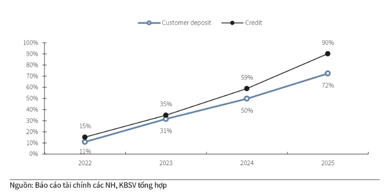 Sự chênh lệch này khiến tỷ lệ cho vay trên huy động (LDR) của toàn ngành ngân hàng – tính trên nhóm 15 ngân hàng lớn nhất do đơn vị phân tích theo dõi – tăng lên khoảng 115%, so với mức 110% hồi đầu năm. Điều này buộc các ngân hàng phải điều chỉnh tăng lãi suất huy động nhằm đảm bảo thanh khoản.