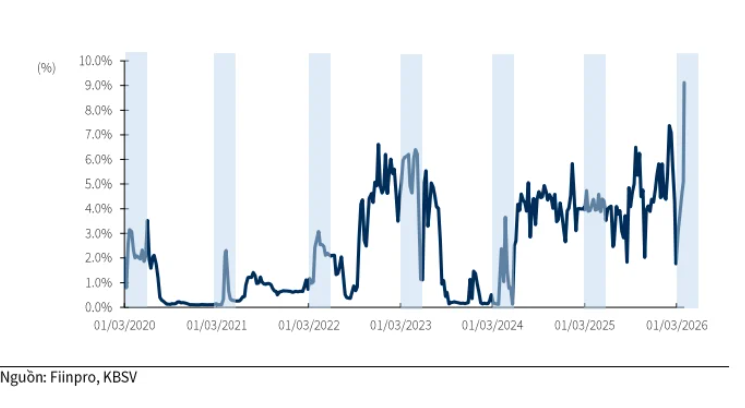 Theo quy luật hàng năm, ông Tùng cho rằng lãi suất qua đêm trên thị trường liên ngân hàng sẽ dần ổn định trở lại sau quý 1. Nhìn chung, chuyên gia từ KBSV đánh giá tình trạng mất cân đối nguồn vốn trong hệ thống ngân hàng có thể kéo dài hết quý 1/2026. Mặt bằng lãi suất khó quay lại vùng thấp như trước, nhưng được kỳ vọng sẽ hạ nhiệt dần và ổn định hơn từ quý 2.