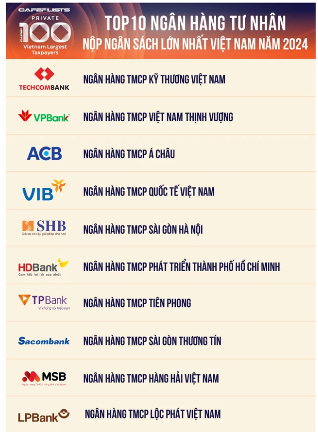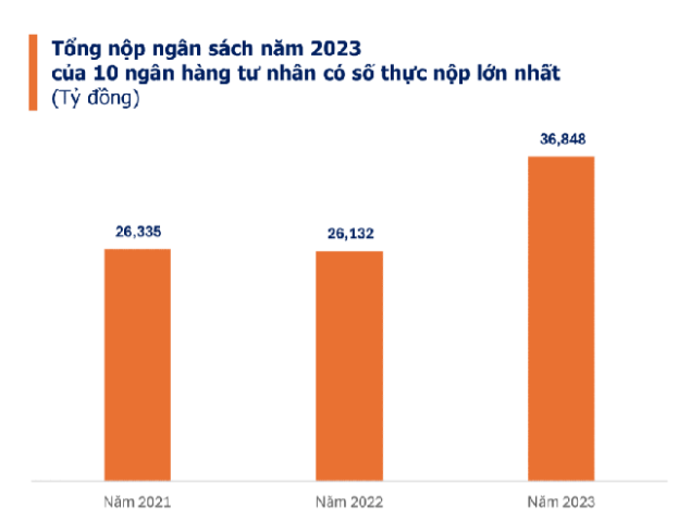 Số liệu tổng hợp từ báo cáo tài chính hợp nhất năm 2023 cho thấy, 10 ngân hàng tư nhân đứng đầu về nộp ngân sách nhà nước gồm: Ngân hàng TMCP Kỹ thương Việt Nam (Techcombank), Ngân hàng TMCP Việt Nam Thịnh Vượng (VPBank), Ngân hàng TMCP Á Châu (ACB), Ngân hàng TMCP Quốc tế Việt Nam (VIB), Ngân hàng TMCP Sài Gòn Hà Nội (SHB), Ngân hàng TMCP Phát triển Thành phố Hồ Chí Minh (HDBank), Ngân hàng TMCP Tiên Phong (TPBank), Ngân hàng TMCP Sài Gòn Thương Tín (Sacombank), Ngân hàng TMCP Hàng hải Việt Nam (MSB), Ngân hàng TMCP Lộc Phát Việt Nam (LPBank).