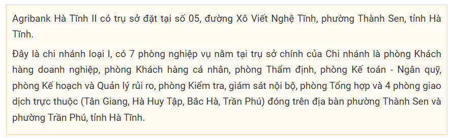 Theo kết luận, trong thời kỳ thanh tra, hoạt động của Agribank Hà Tĩnh II cơ bản chấp hành các quy định pháp luật. Một số mặt tích cực: Đơn vị tuân thủ cơ bản các quy định về lãi suất huy động, không có hành vi vượt trần lãi suất. Hoạt động tín dụng và huy động vốn tăng trưởng ổn định.