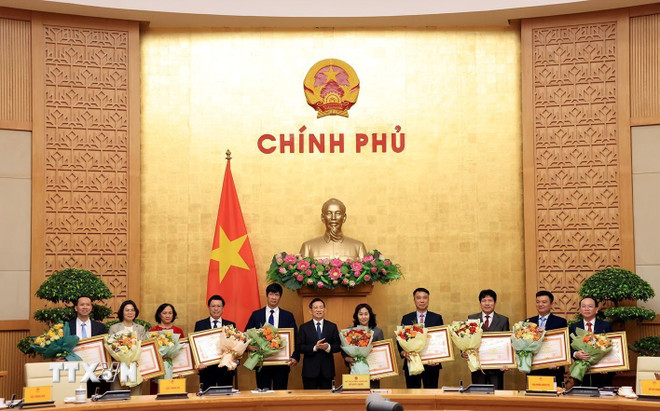 Phó Thủ tướng Hồ Đức Phớc trao Bằng khen của Thủ tướng Chính phủ cho các cá nhân vì đã có thành tích trong thực hiện Tổng điều tra nông nghiệp 2025. (Ảnh: Tuấn Anh/TTXVN)