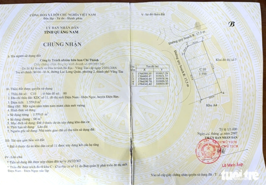 Vào năm 2012, Công ty TNHH Chí Thành là chủ dự án ở khu đô thị mới Điện Nam - Điện Ngọc (Quảng Nam) chuyển nhượng lô đất giá 2,1 tỉ đồng cho ông Võ Văn Thiện. Sau khi lập hợp đồng chuyển nhượng, ông Thiện đăng ký chỉnh lý biến động nhưng không được do công ty chưa nộp tiền sử dụng đất cho nhà nước.