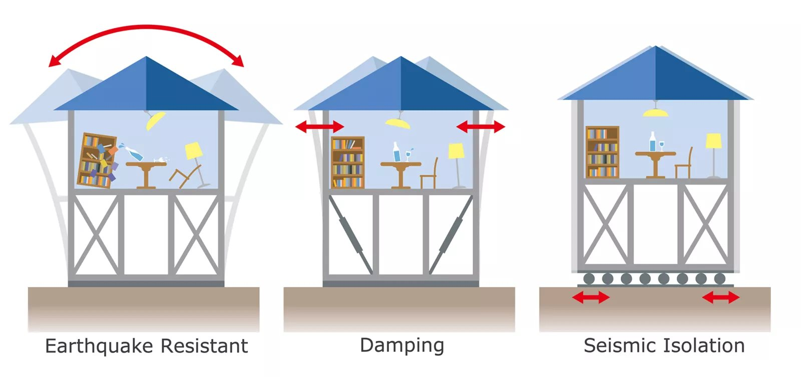 Seishin (Giảm chấn) sử dụng các thiết bị hấp thụ năng lượng như tấm giảm chấn, trụ thủy lực hoặc các quả lắc treo ở các tầng cao. Khi tòa nhà bắt đầu dao động, các thiết bị này sẽ hoạt động như những "bộ giảm xóc" khổng lồ, chuyển hóa năng lượng động đất thành nhiệt năng, giúp giảm biên độ rung lắc đáng kể, bảo vệ cả cấu trúc lẫn nội thất.